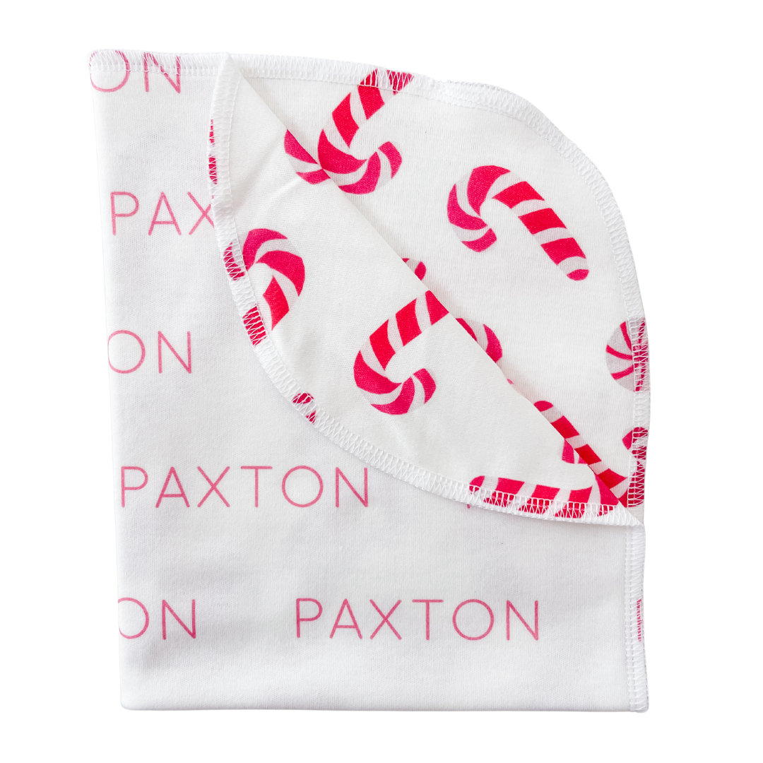 Loading... Please wait...This personalized Candy Canes double-sided swaddle baby name blanket is perfect for newborns, babies, infants and kids. It's a perfect newborn gift or baby shower gift. Great as a swaddle blanket, tummy time blanket, a car seat cover or a snuggle blanket.