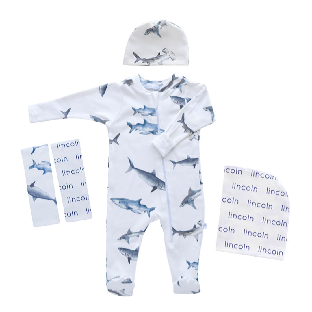 Combo incluses: zip footie, beanie, personalized blanket, and a set of 2 personalized burp cloths.