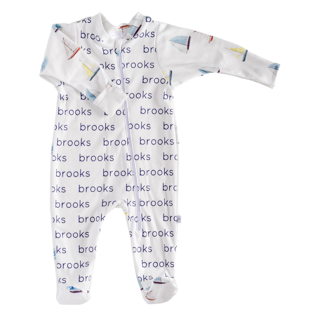 Loading... Please wait...No need for a shirt, pants or shoes! A sailboat personalized footie is the only thing your child will need.